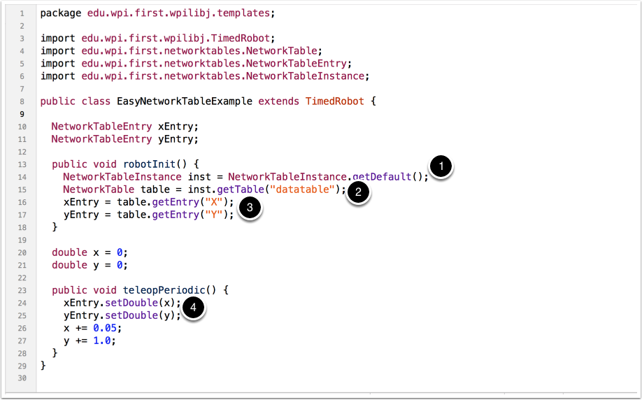 The NetworkTables classes are instantiated automatically when your program starts. To access the instance of NetworkTables do call methods to read and write the getDefault() method can be used to get the default instance.