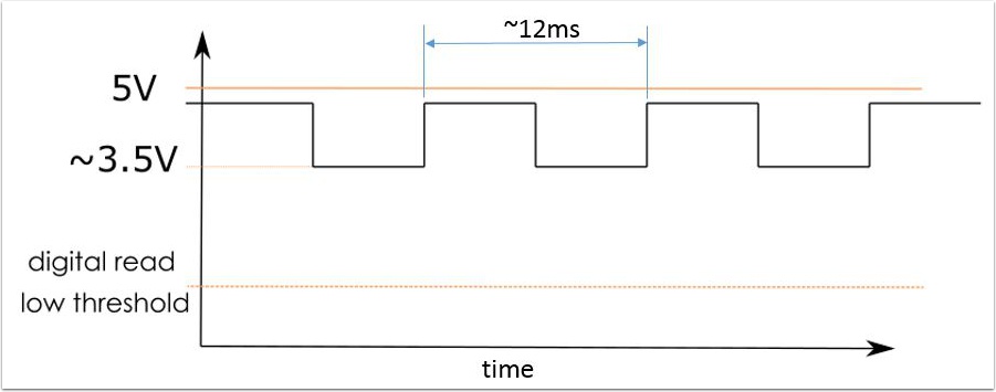 The hall circuit in the motor causes a voltage drop for each armature rotation. The square wave output and voltage drop is dependent on the voltage input to the circuit. As wired per the figure above, a typical output is show below. Due to the voltage not dropping low enough, the signal cannot be read by the DIO on the RoboRio. Motor input 12V free speed gives ~12ms pulse.