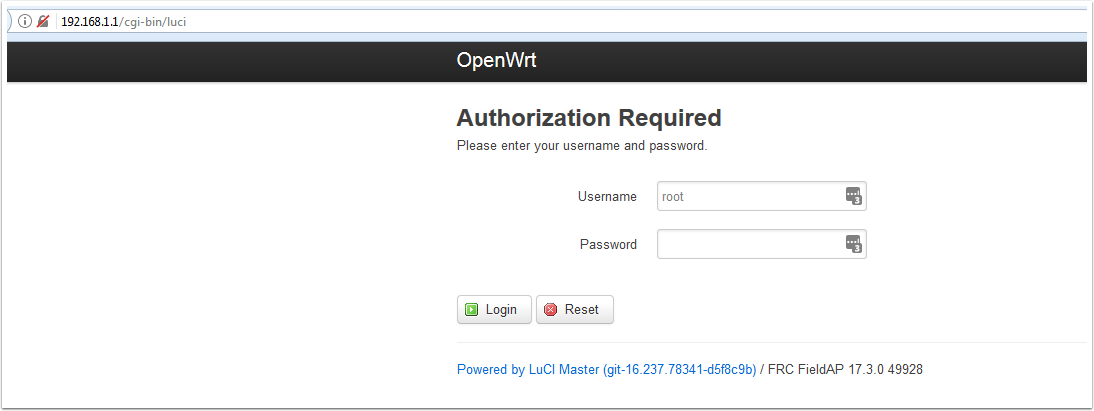 Password: "root" (for an FRC image) or blank for default OpenWRT