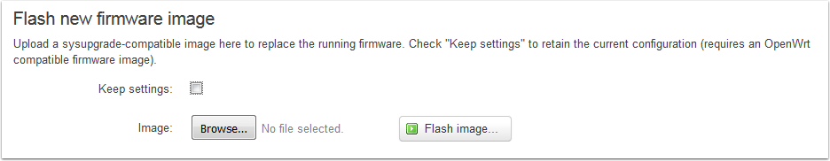- Click Flash image... and wait for the process to complete. If you are upgrading from a stock OpenWRT image, the page may never reconnect after the firmware flash. Wait about 5 minutes to be sure the process is complete, then change your connection to the yellow "Internet" port to reconnect on the 192.168.1.1 address or change your PC to DHCP to connect on the 10.0.100.2 address.
