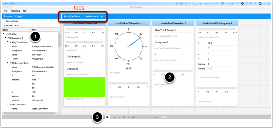 - Tab panes: This is where you data is displayed from the robot or other sources. In this example it is Test-mode subsystems that are shown here in the LiveWindow tab. This area can show any number of tabbed windows, and each window has it's own set of properties like grid size and auto-populate.